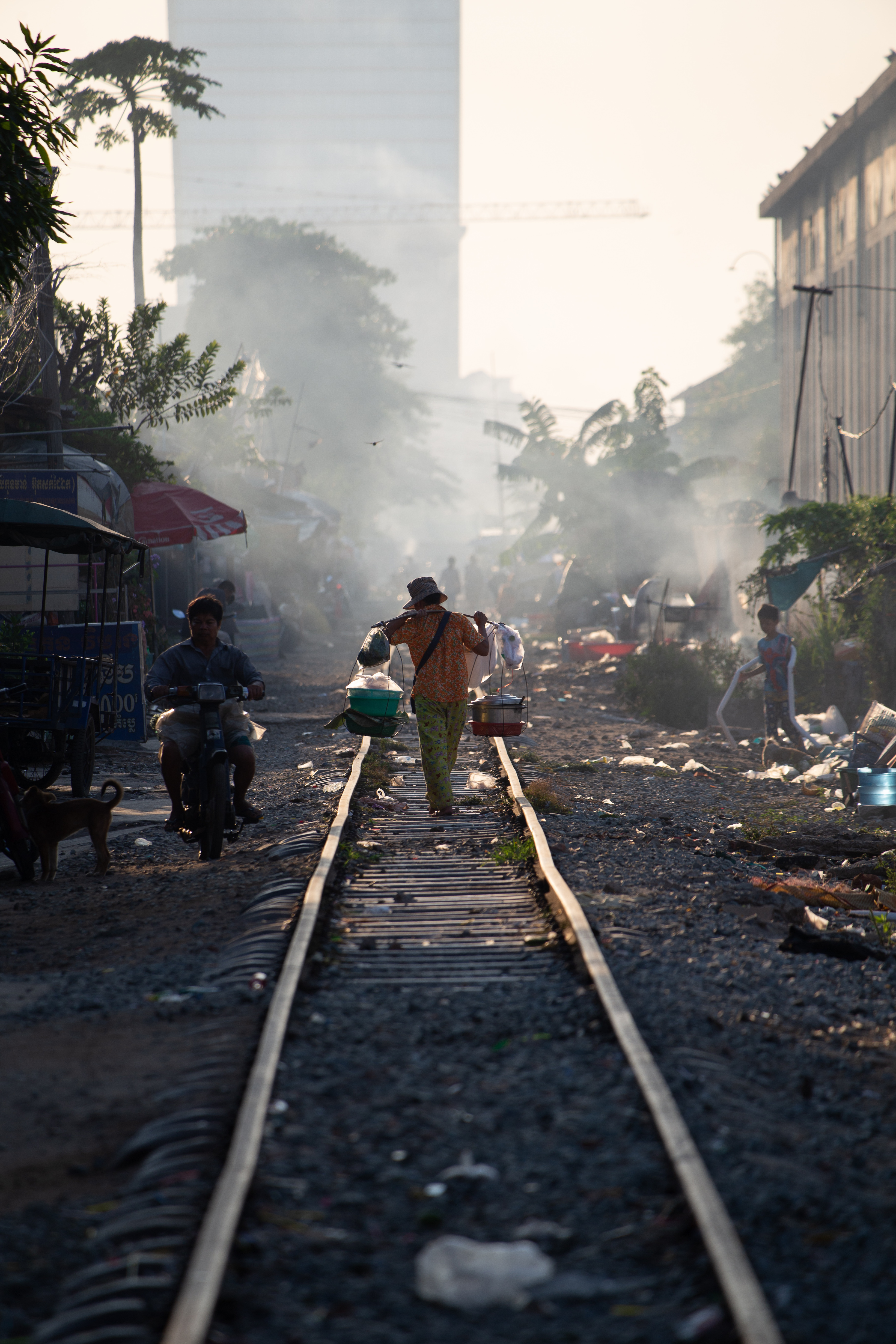 Life goes on A woman carrying the loads on her shoulders and walking towards down town through smoky railway, at 0545am in the morning